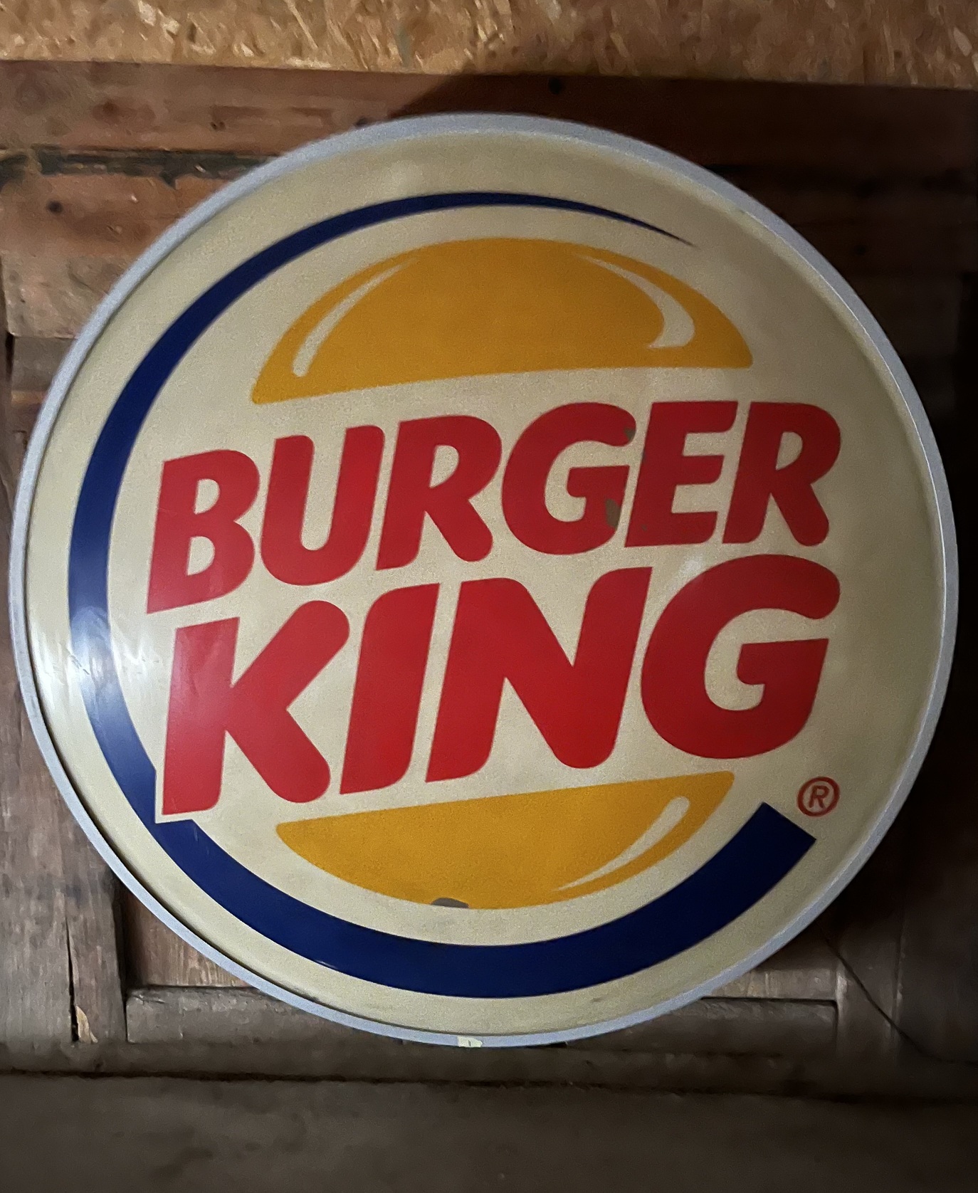Enseigne lumineuse Burger King, modèle américaine avec verre plastique bombée, restaurée et fonctionnelle en 220V, diamètre 190cm.