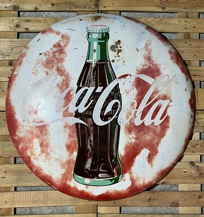 Magnifique plaque emaillée (dit bouton) Coca-Cola, datant de 1951, authentique et originale, superbe patine faite avec le temps, grand format, diamètre 109cm.